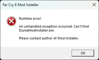If you unpacked Mod Installer from the zip archive and you get error message or the file "DuniaModInstaller.exe" is missing, make sure your antivirus protection program didn't eat it.